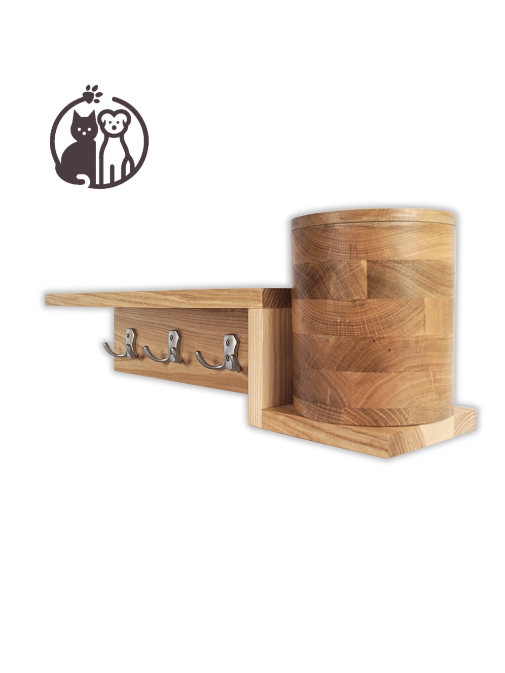 Jedinečná dřevěná police s věšáky na psí potřeby z masivního dřeva – na výběr máte z několika druhů dřeva: dub, olše, modřín, jasan nebo borovice. Každý kus zdobí detailně vyřezaný motiv tlapky, který potěší oko i srdce každého milovníka psů nebo koček.