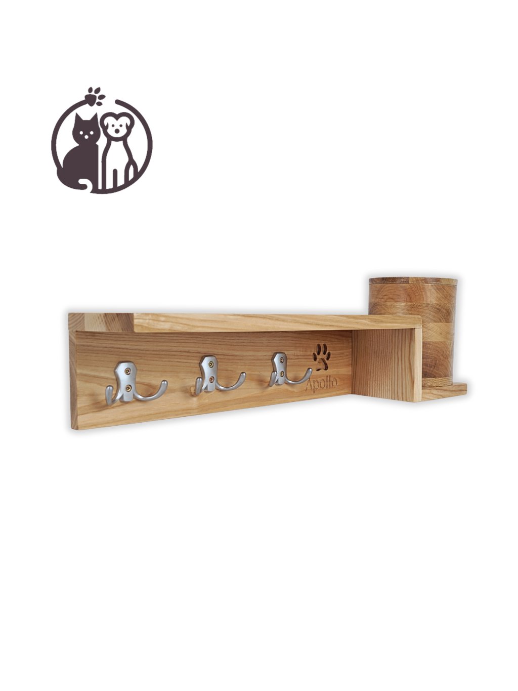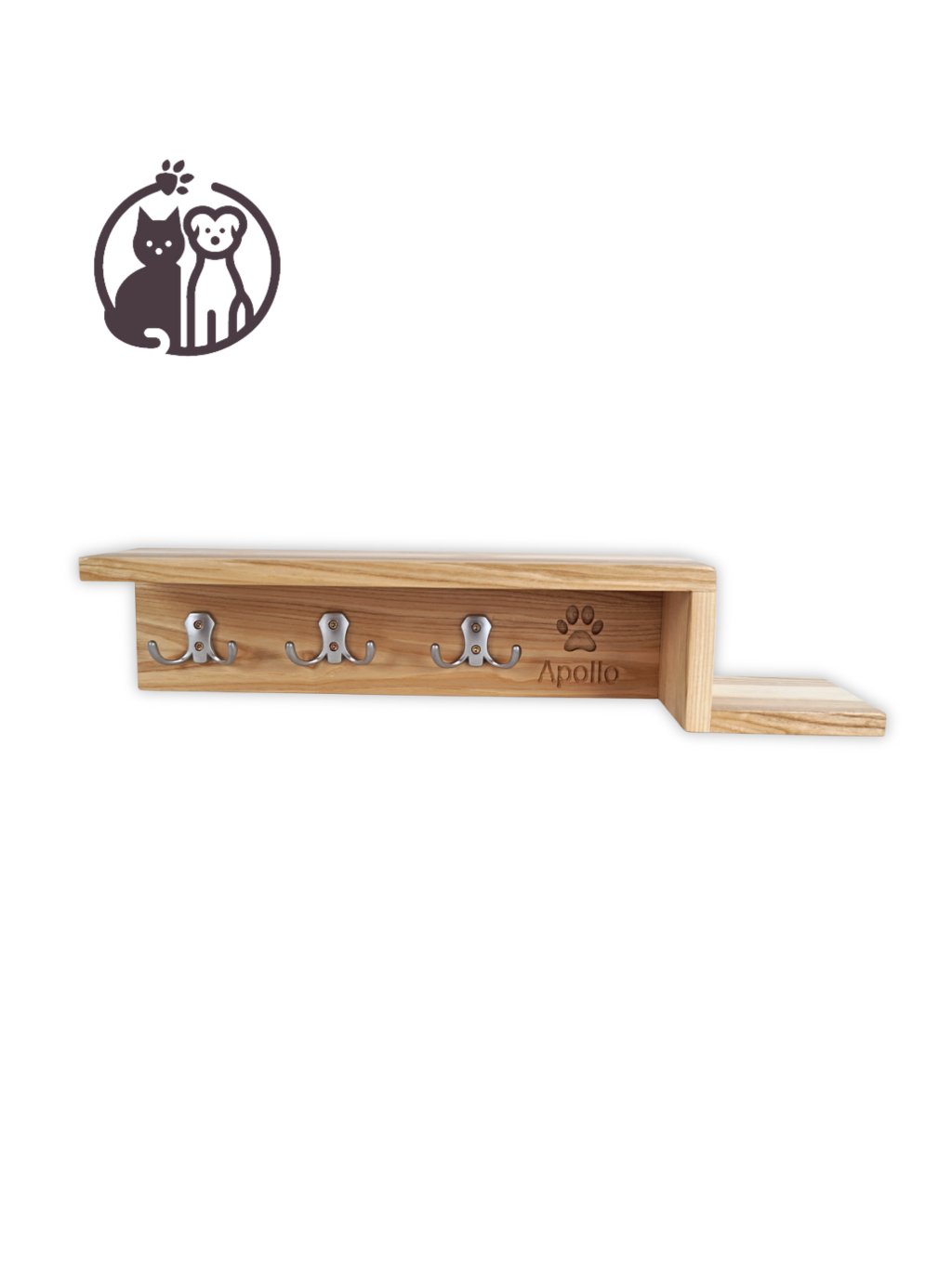 Originální dřevěná police se třemi háčky na psí doplňky o délce 60cm, výšce 12,5cm a hloubce 13cm, který spojuje praktičnost s láskou ke psům a kočičkám. Každý kus je pečlivě vyráběn z kvalitního masivního dřeva a nese motiv vyřezané tlapky, který doplní každý interiér – ať už jde o vaši předsíň, chodbu nebo psí koutek.