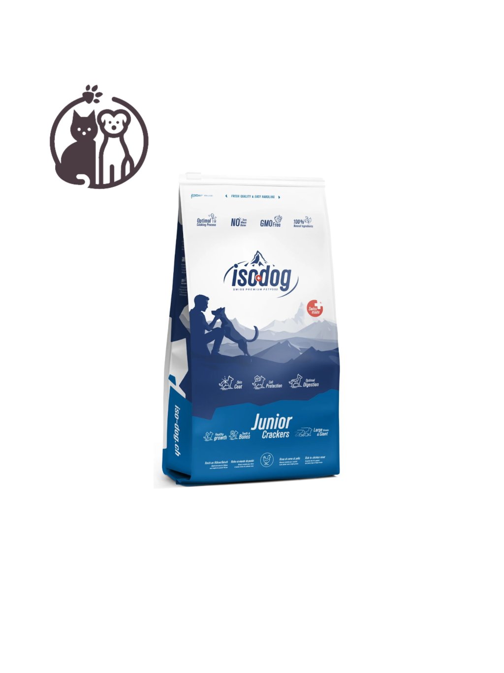 Iso-dog JUNIOR Crackers Kuře – švýcarské superprémiové krmivo vyvinuté speciálně pro štěňata a mladé psy velkých a obřích plemen. Kuřecí maso, optimální poměr živin a funkční látky zajišťují rychlý, ale zdravý růst bez zbytečné zátěže kloubů.