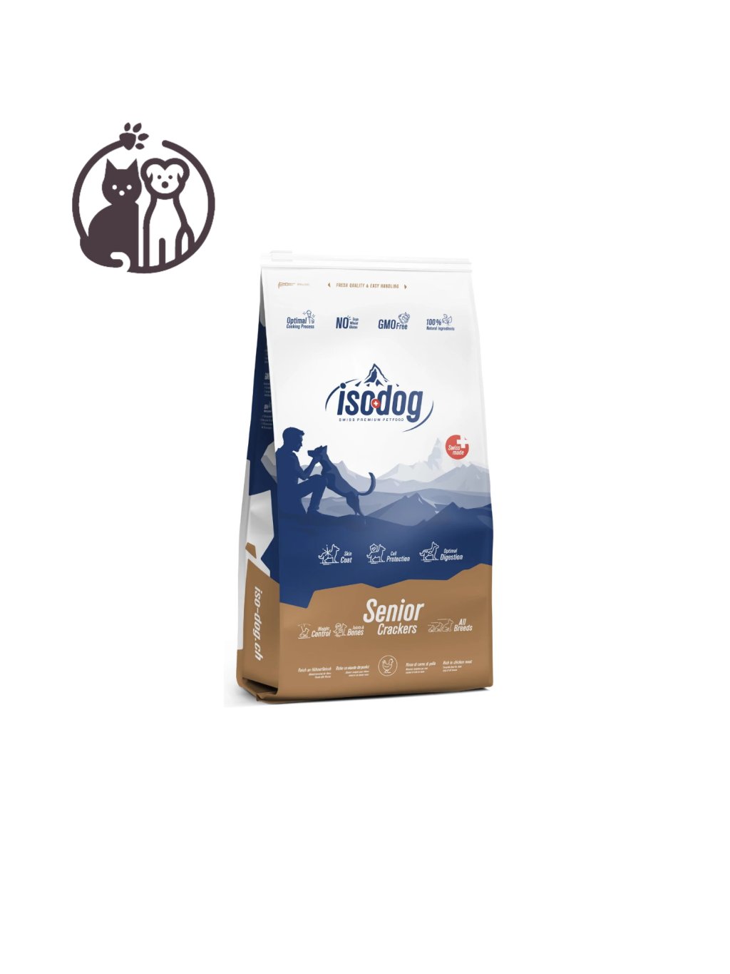 Iso-dog SENIOR Crackers Kuře je kompletní krmivo pro starší psy všech plemen (od cca 7–8 let). Vyvážená receptura s kuřetem podporuje klouby, optimální hmotnost i citlivé trávení.