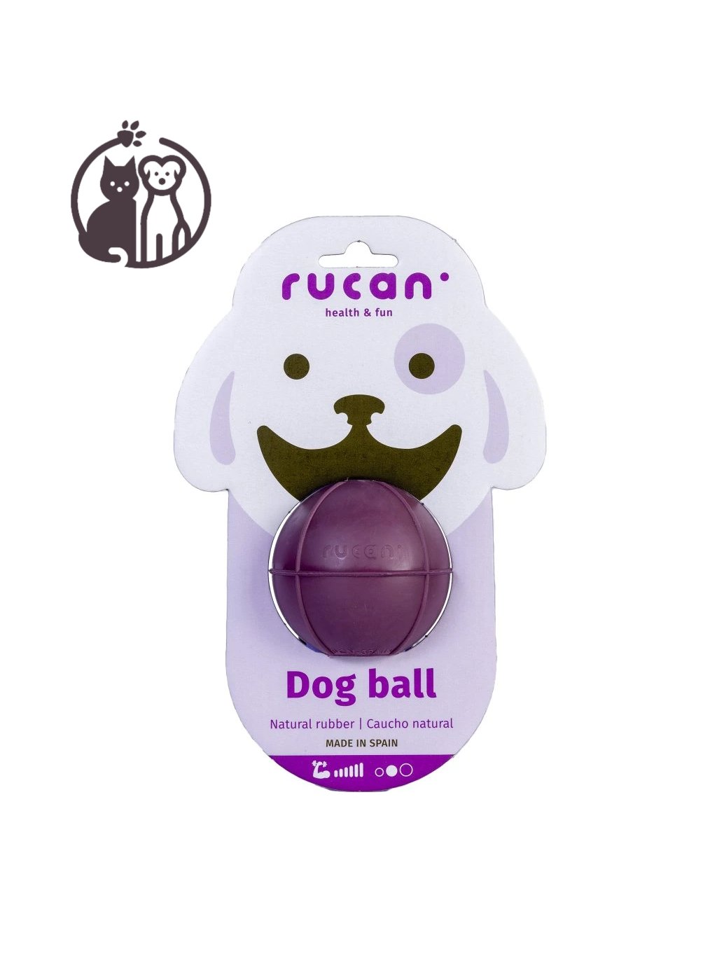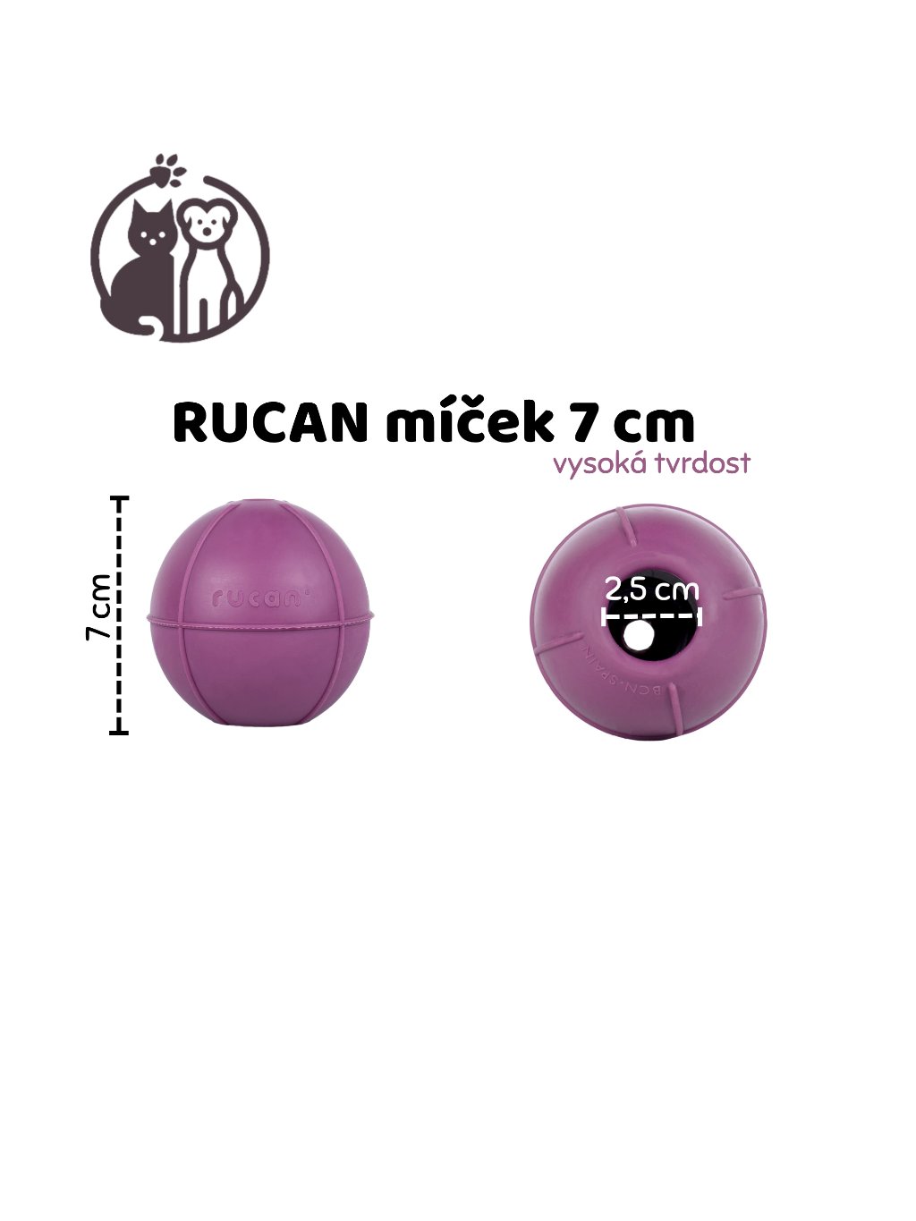 Rucan plnící míček (7 cm, fialový) – španělská hračka z přírodního kaučuku pro psy, která zabaví i zklidní. Je plnitelný dobrotami, můžete ho zamrazit pro extra dlouhou zábavu a díky odolnému materiálu je fialová varianta vhodná pro silnější kousání.